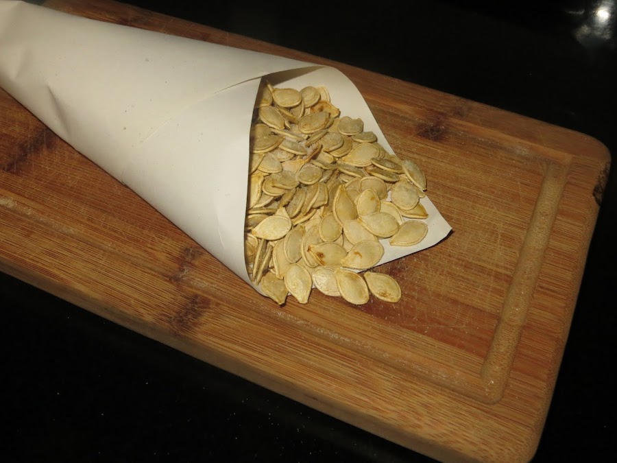 Sacamos las pipas de la calabaza y le quitamos las fibras, este es el paso más engorroso. Luego cogemos papel absorbente y las secamos. Ahora las extendemos en un plato y las ponemos a secar pueden tardar varios días. Les echamos sal de vez en cuando para que vayan absorbiendo la humedad.