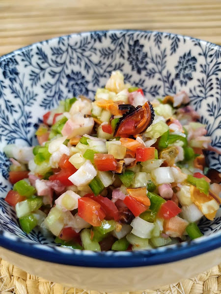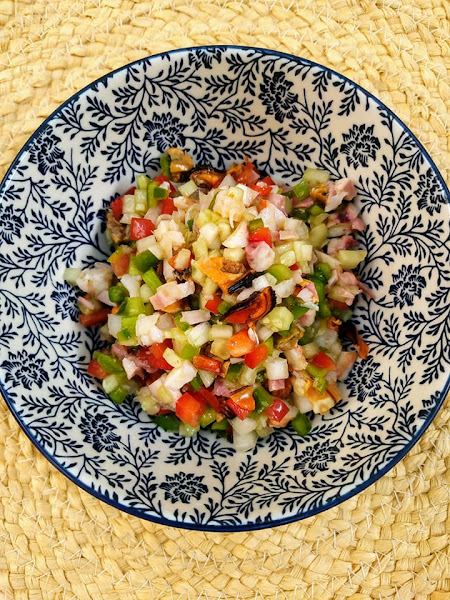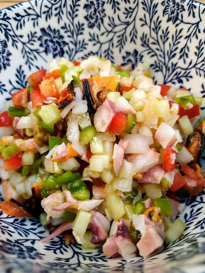 Hacemos lo mismo con el pulpo, lo mejillones y los langostinos cocidos, mezclamos con la pipirrana, sazonamos al gusto y añadimos un buen chorro de aceite de oliva y de vinagre, metemos en la nevera y comemos bien fresquita!!