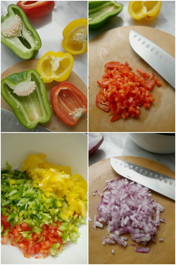 Cut peppers into halves, keep one piece into the fridge, and cut the remaining part into small dice. Place into a bowl.