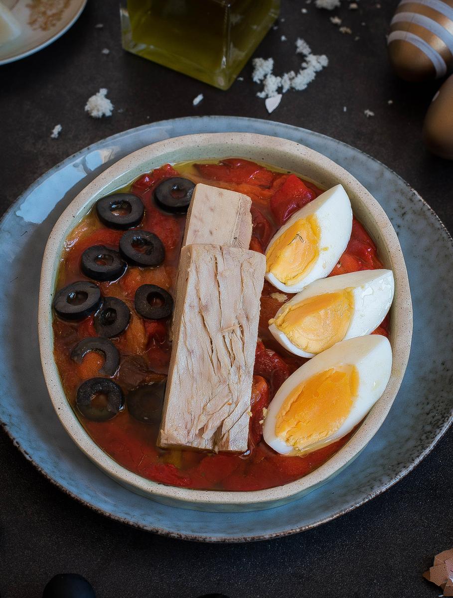 Colocamos el atún encima de los pimientos así como las aceitunas negras picaditas.