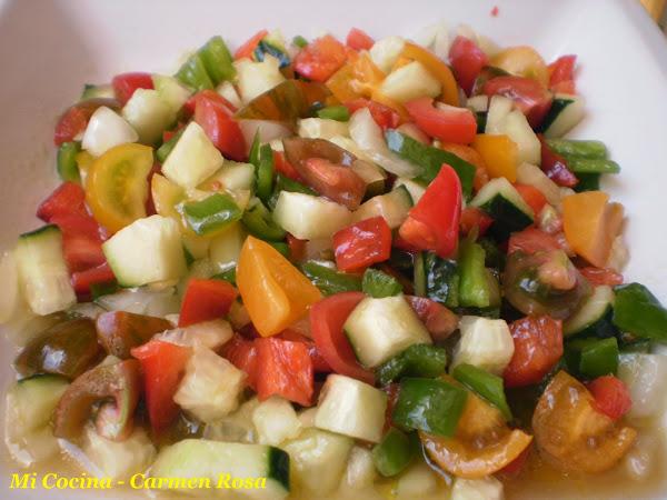 Tres tomates pequeños de cada color (amarillo, naranja, rojo, verde?.se pueden encontrar hoy en día en cualquier supermercado), un pimiento verde tipo italiano, medio pimiento rojo (de los de asar), media cebolla blanca dulce, medio pepino (si es muy grande), vinagre de vino (tres o cuatro cucharadas soperas), sal y seis cucharadas soperas de aceite de oliva virgen extra (a ser posible malagueño).