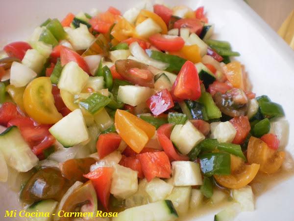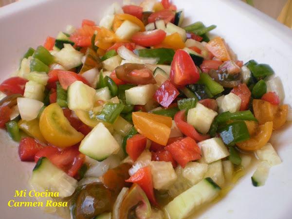 Un plato tradicional en mi cocina, en la de mis mayores?..receta llena de añoranzas y recuerdos, presentada en una fuente blanca con bordes azules, que hoy en día llamaríamos "vintage", ´puesta en el centro de la mesa familiar de cuyo contenido hacíamos buena cuenta a base de cucharadas. Porque ésta ensalada, ésta pipirrana malagueña se come con cuchara.