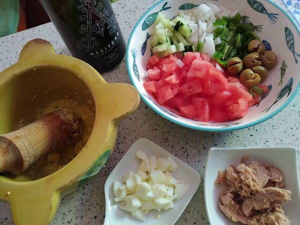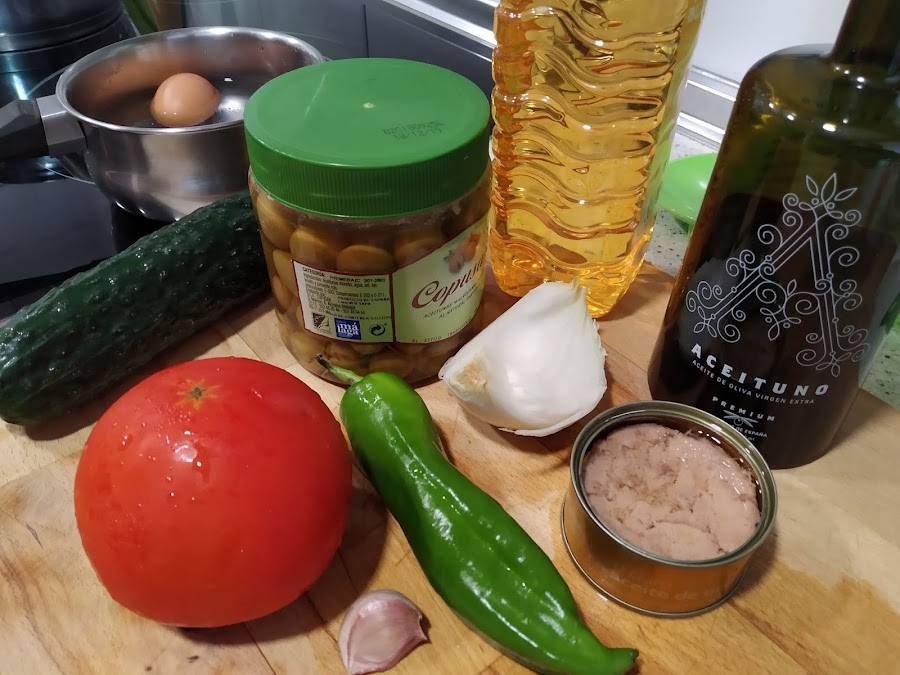 Un tomate grande maduro, medio pepino, un pimiento verde (tipo italiano), un trozo pequeño de cebolla (blanca dulce), un diente de ajo, un huevo cocido (que la yema esté dura), vinagre de vino blanco, sal, aceitunas partidas y aliñadas, una lata de atún en conserva y aceite de oliva virgen extra.