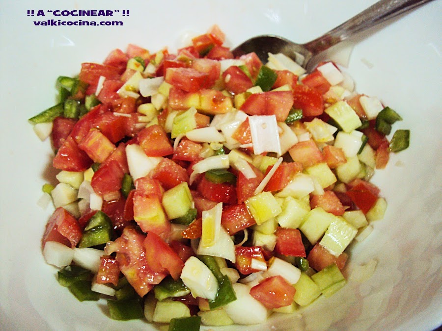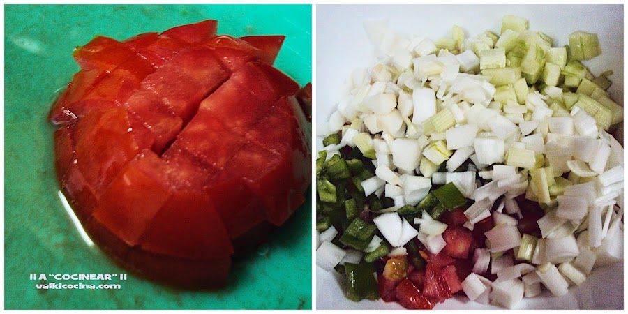 Corta los ingredientes en cubos regulares de tamaño moderado, ( brunoise ), y ve pasándolos a un cuenco.