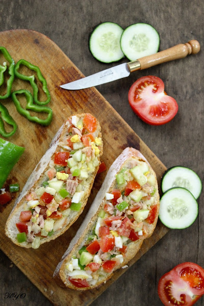 4. Aliñamos con sal, un buen chorro de aceite y vinagre al gusto. Servimos la ensalada sobre unas buenas rebanadas de pan de pueblo (opcional).
