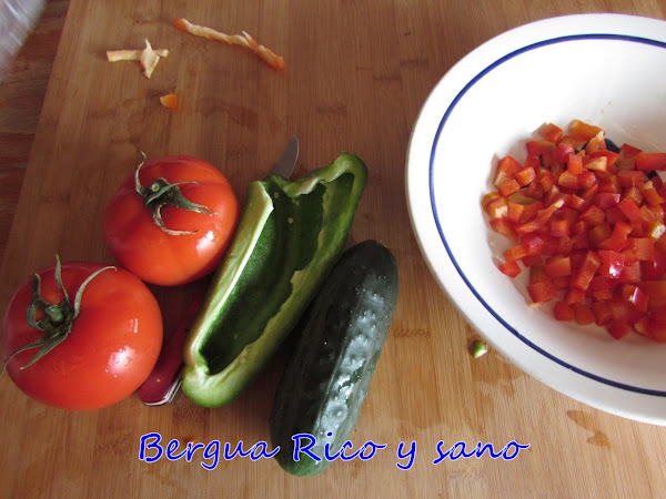 2. En cuanto al pepino, pero si es español (de piel gruesa y rugosa), lo pelamos parcial o totalmente. Después lo cortamos en daditos también.
