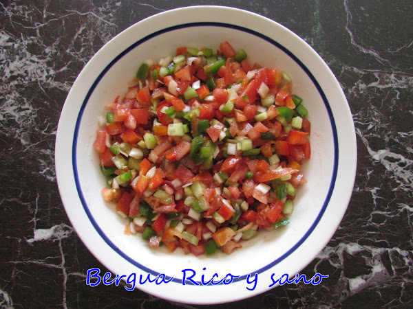 3. Mezclamos todas las verduras y aliñamos al gusto con aceite, sal, vinagre o limón y, si queremos, una pizca de comino en polvo. Como decía, en verano en mi casa le ponemos cubitos de hielo para que se mantenga más fría.