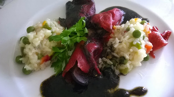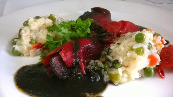 Cuando el Tomate este refrito, añadimos los Calamares el trozos pequeños cortados, le añadimos la sal, la Pimienta Molida y el Vino, dejamos reducir el vino, y le añadimos la Tinta de Calamar, y