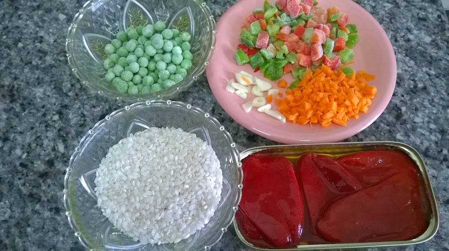 En una Cazuela con dos vasos de agua la ponemos ha hervir, añadimos cuando este hirviendo los pimientos, la Zanahoria, los guisantes, junto al Arroz, el Ajo lo reservamos para el sofrito.