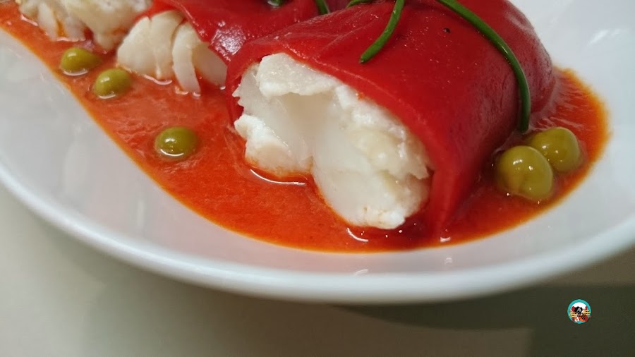 2.-Rellenamos los pimientos con los lomos de bacalao, si son pequeños ábrelos por la mitad y envuelve el bacalao con dos pimientos abiertos y ata con un cebollino fresco.
