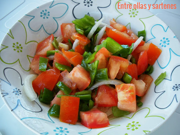 Lavamos los tomates y los pimientos y los cortamos a dados.