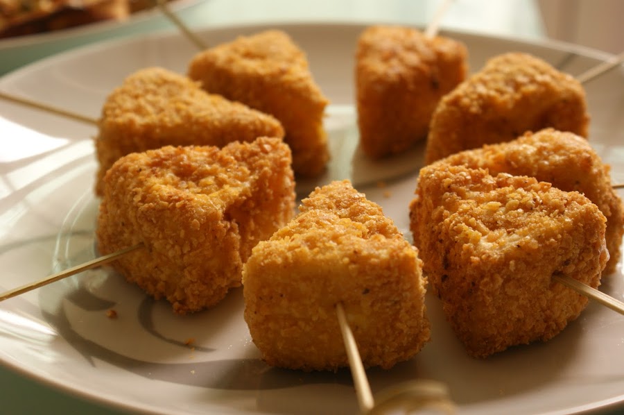 Se congelan las porciones de queso para luego poder trabajar y rebozar sin que se rompa (yo lo congelé de un día para otro).