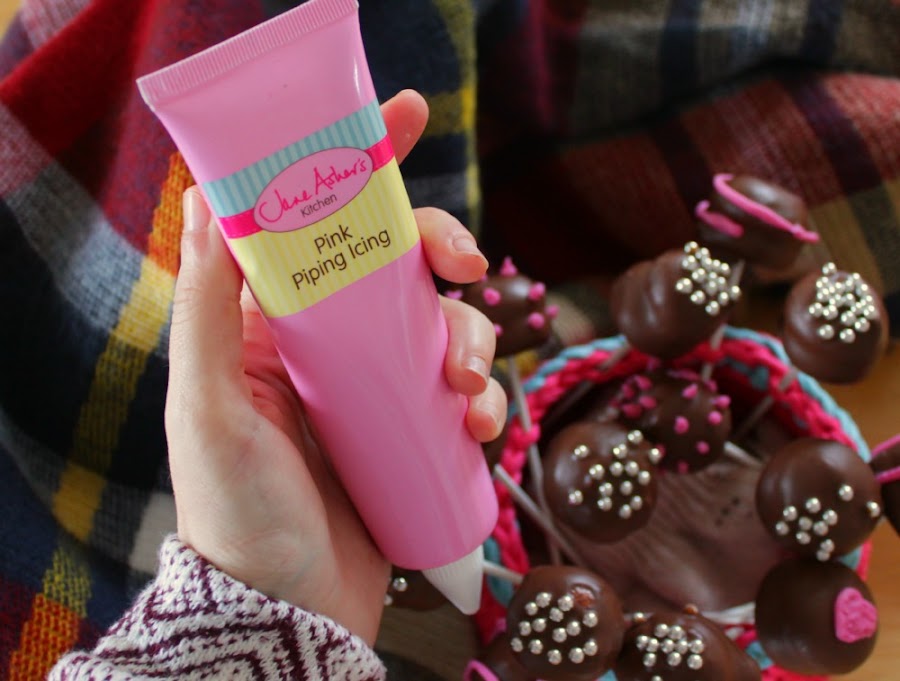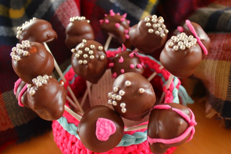Derretimos al baño maría la tableta de chocolate lentamente a fuego bajo. Cuando tengamos el chocolate derretido, mojamos las piruletas por todos los lados asegurándonos que el chocolate cubra toda la superficie. A continuación las podemos sujetar en algún material blando parecido a la espuma o plastelina hasta que el chocolate se endurezca.