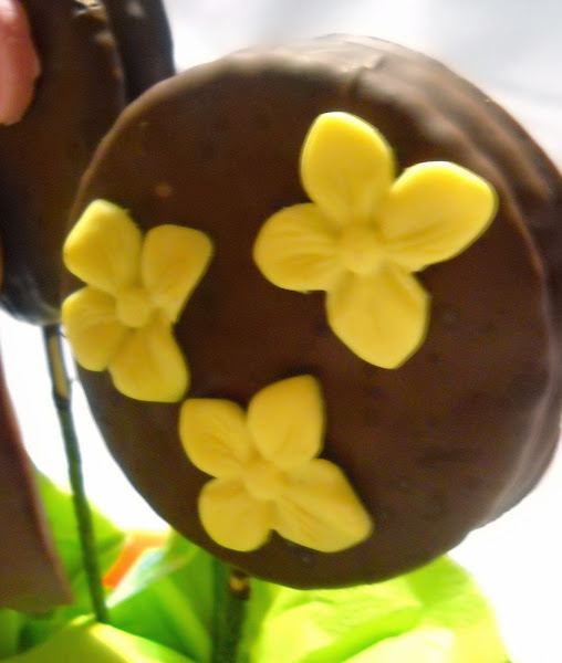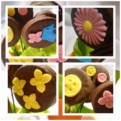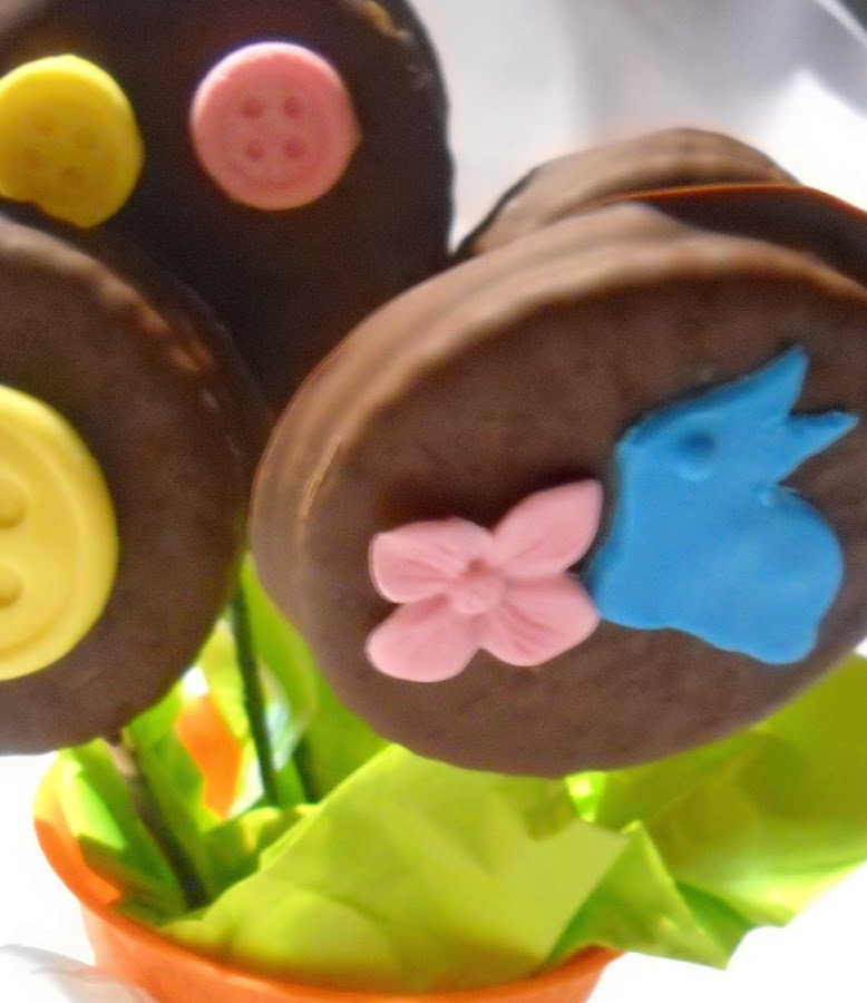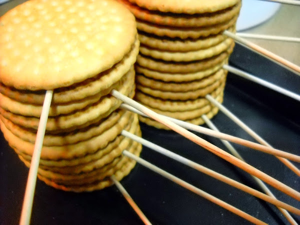 Luego cogemos las brochetas y mojamos la punta en el pegamento comestible y no introducimos en el relleno de la galleta con mucho cuidado...y si no tienes pegamento usa el chocolate fundido. Fundimos el chocolate al baño maría o en el microondas, a intervalos de 20 segundos con cuidado de que no se nos queme.