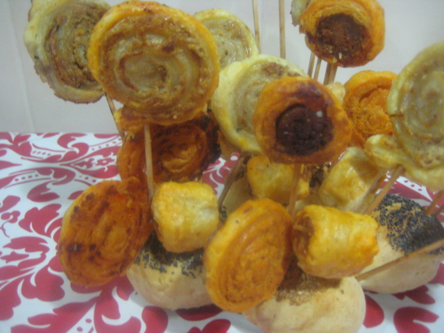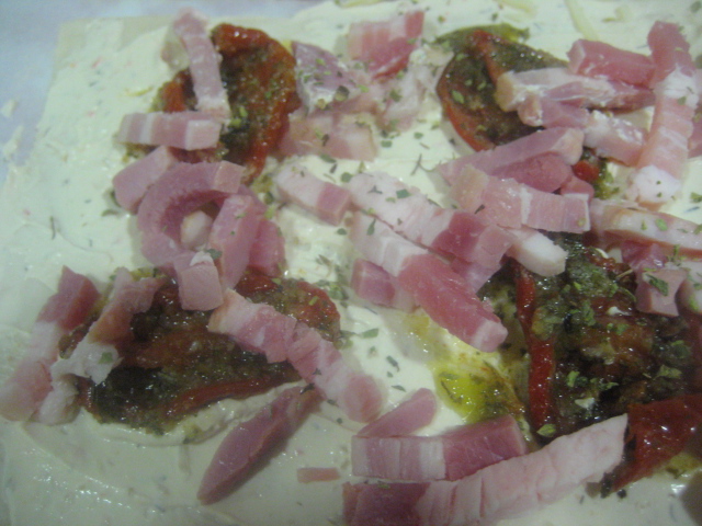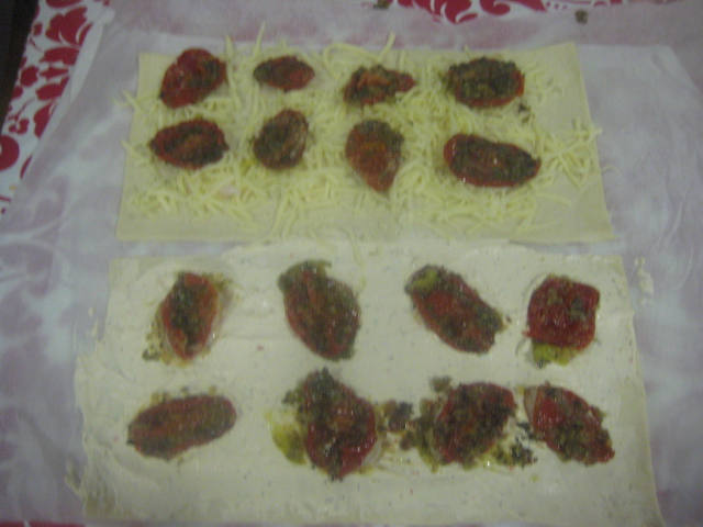 PIRULETAS DE HOJALDRE CON QUESO CREMA, BACON Y TOMATE SECOSIngredientes:para 20 piezas
