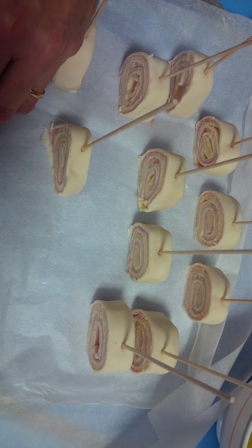 Colocamos encima el jamón de york, después el queso y lo enrollamos como si fuera un brazo de gitano, lo metemos una media hora en la nevera, para que al cortar las porciones queden mas definidas.