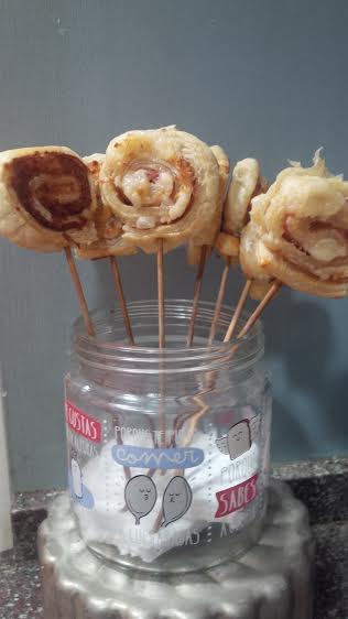 Y las colocamos en una bandeja de horno. Generalmente los paquetes de hojaldre vienen acompañados de una hoja de papel de horno, que la utilizaremos para hornear nuestras piruletas. Batimos el huevo y pintamos las piruletas por delante y por detrás. y las horneamos hasta que estén doradas.