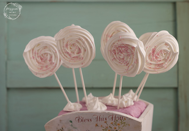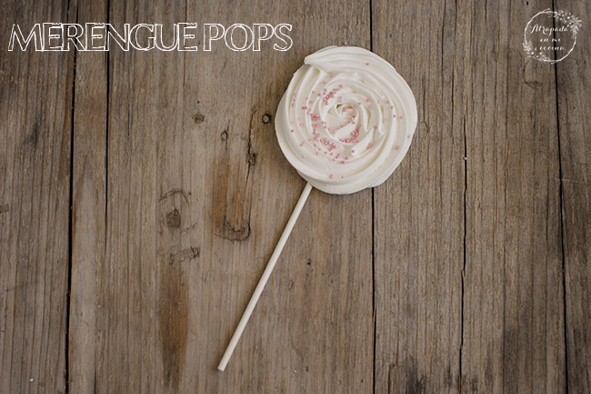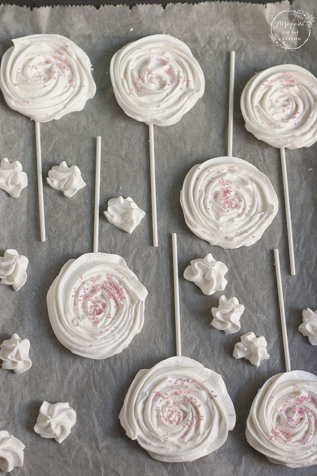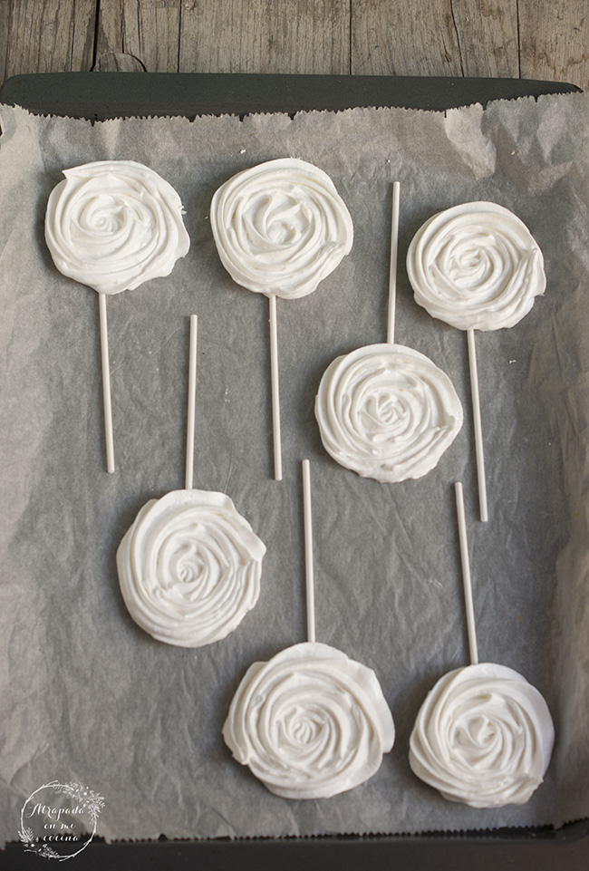 Uno de los productos estrella de mis mesas dulces son estas piruletas de merengue. Hace tiempo que las hago y ya son muchas personas las que me han pedido la receta. Y aprovechando que las he hecho de nuevo aquí os dejo la receta, que no es más que la receta de los besitos de merengue pero con una forma muy atractiva. Las horneo ya con el palo, aunque si queréis hacer más cantidad para que os quepan en la bandeja hay que hacerlas sin el palo, y luego pegárselo con un poquito de glasa y dejar que se seque.