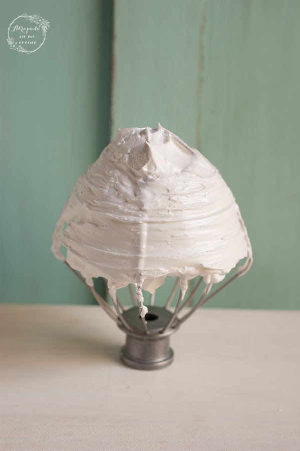 Yo he montado el merengue en la Kitchen Aid, aunque podés hacerlo en vuestra batidora de varillas o similar. Como ya sabéis tiene que estar muy bien limpio y seco el bol. Añadimos las dos claras, empezamos a batir a velocidad lenta y cuando empiece a tomar cuerpo añadimos el azúcar, subimos la potencia y añadimos unas gotas de zumo de limón. Batimos durante unos cinco minutos, hasta conseguir un merengue de la consistencia del que se ve en la foto de arriba.