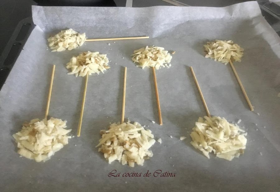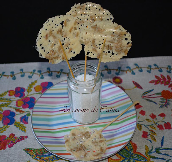 Si queréis tener un aperitivo rápido y rico, os dejo estas piruletas de queso parmesano hechas y comidas por Daniel, es como el monstruo de las galletas comiéndose las piruletas.