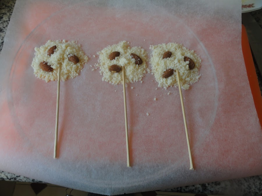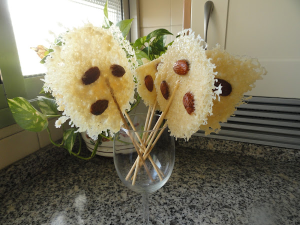 Rallamos el queso, y formamos unos montoncitos sobre el papel de horno. Lo trabajamos mejor en el plato del microondas para no tener que moverlos después, ya una vez preparados los llevamos al microondas y así se nos mueve menos. Los colocamos un poco separados, y en el centro de cada montón colocamos el palito, cubrimos el palito con un poco más de queso, para que se quede bien pegado, y ponemos las almendras. Cubrimos con más papel y ponemos en el microondas. Yo los he tenido sólo un minuto a la máxima potencia, pero depende del microondas. Sacamos, dejamos enfriar y despegamos con cuidado del papel... y a disfrutar!!!