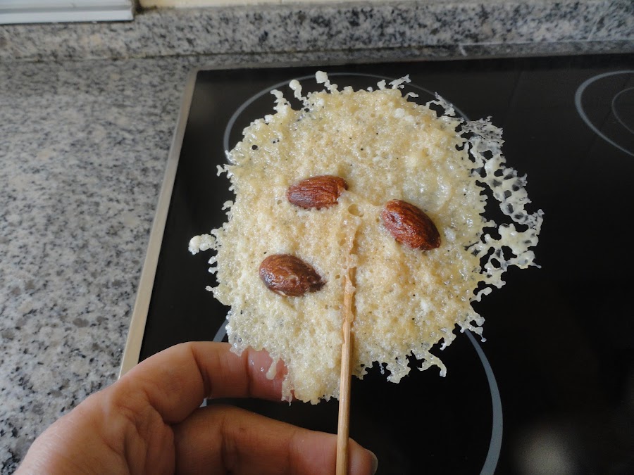 Estas famosas piruletas de parmesano no las había preparado nunca, y ya le llegó el turno... Las he hecho poniéndoles también unas almendras con sabor a bacon que incluye la caja DISFRUTABOX de este mes.