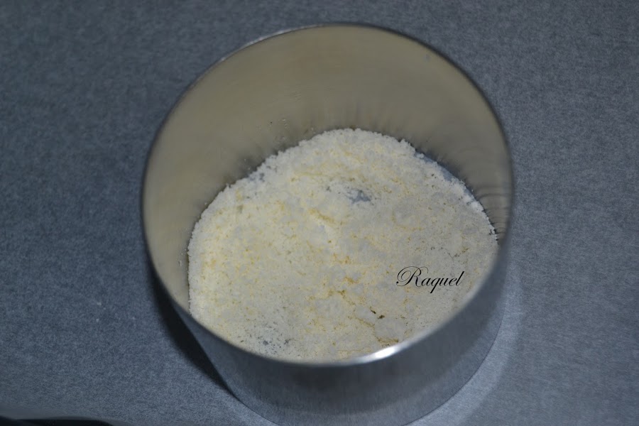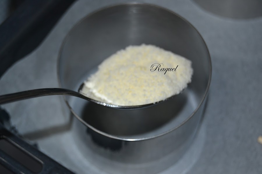 Ponemos en la bandeja del horno el papel y con la ayuda de un aro de emplatar iremos haciendo las piruletas para que queden bien redonditas.