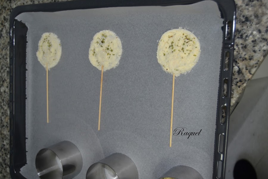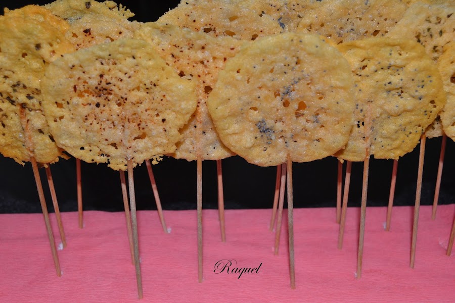 Había visto muchas fotos por pinterest de estas piruletas y mire muchas recetas y la verdad todas se basaban en en una, osea en queso rallado parmesano fundido y tostado en el horno, con algún toque de sabor con especies.