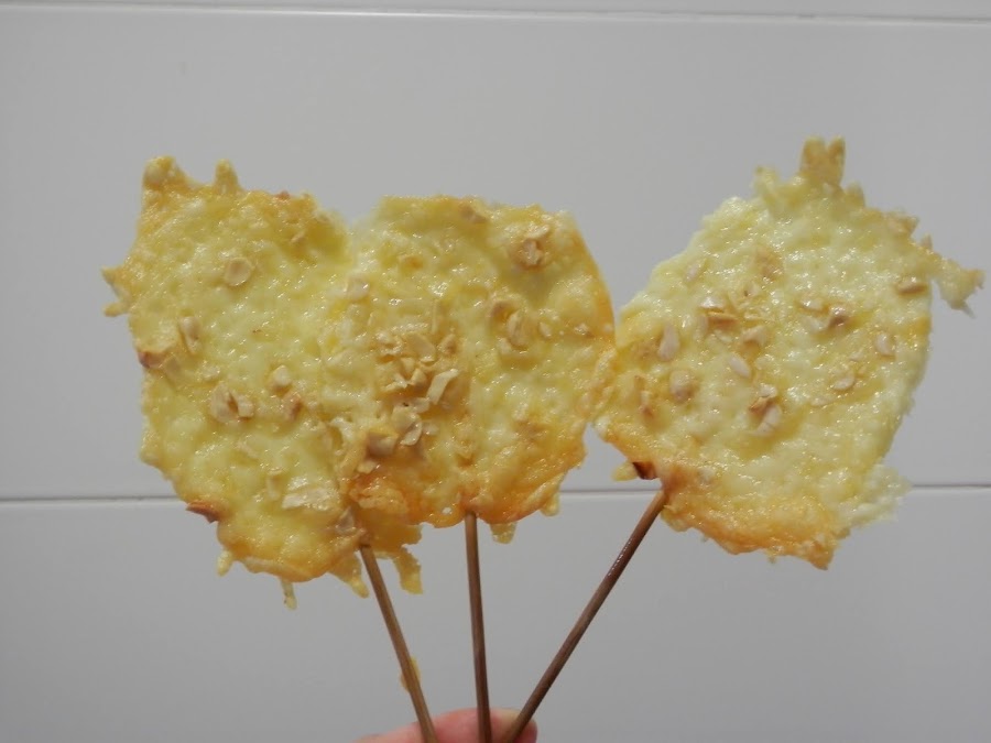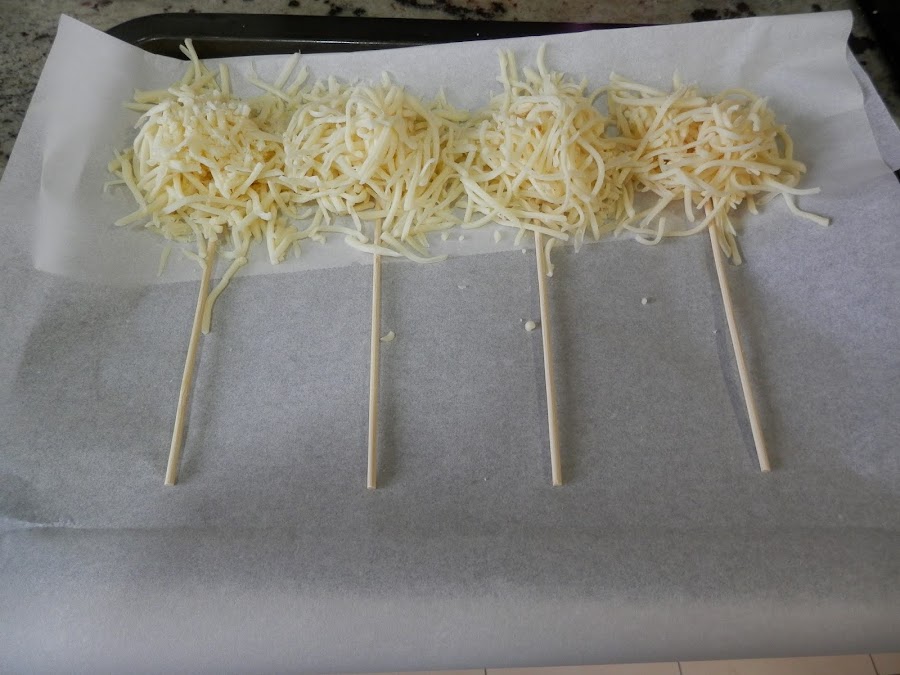En una bandeja de horno, haz montoncitos de queso rallado y pon el palillo de la brocheta.