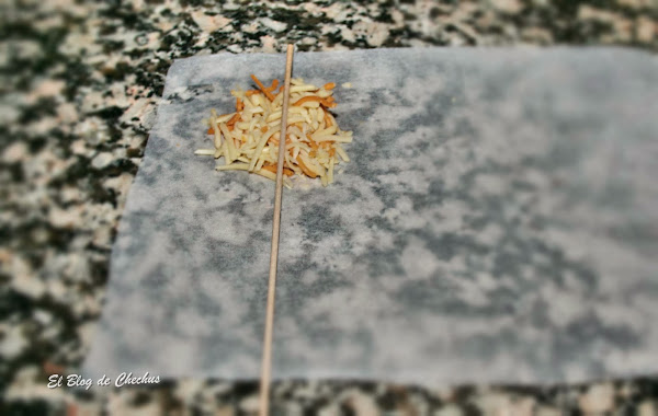 Empezamos poniendo en un trozo de papel de hornear, en la parte superior, un montoncito del queso, y poniendo una brocheta, como veis en la foto, con la parte de la punta hacia abajo.