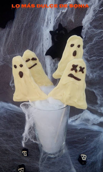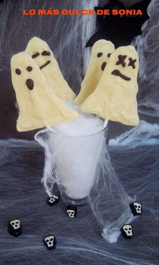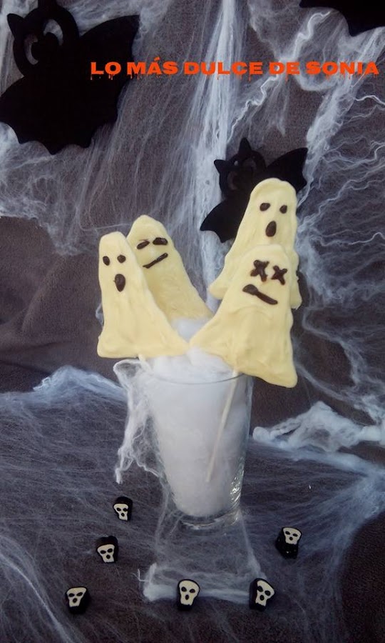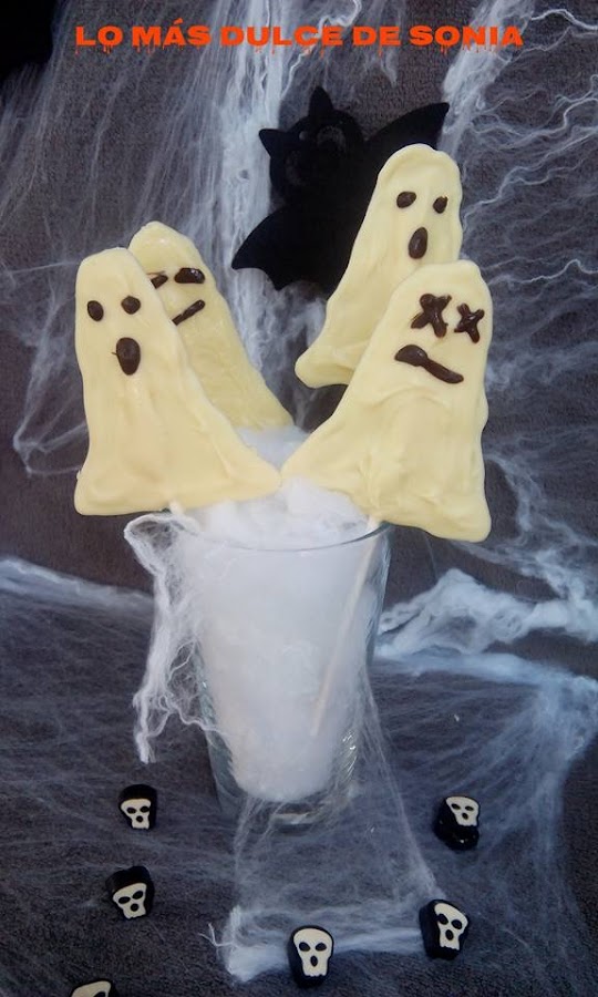 En primer lugar ponemos el chocolate blanco troceado en un bol y lo derretimos al baño María o en el microondas. Yo derretí media tableta, salen unas ocho o diez, dependiendo del tamaño del fantasma.