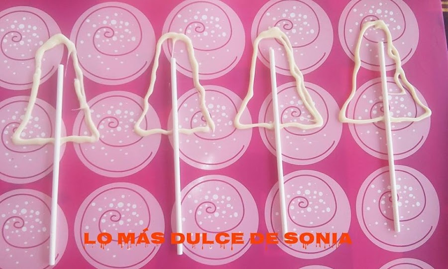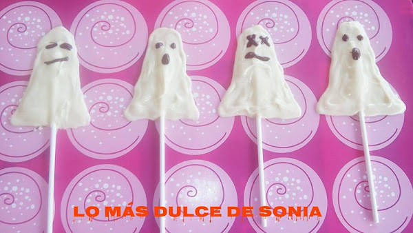 Cogemos la lamina de silicona y con ayuda de una jeringa, en mi caso, hacemos la silueta del fantasma, colocamos el palito en medio y rellenamos bien con el chocolate blanco.
