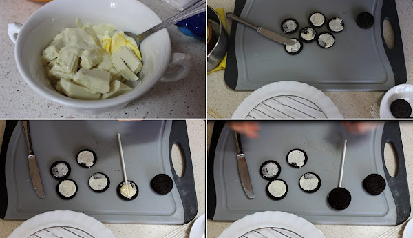 Abrimos las galletas y ponemos un poquito de chocolate blanco en el centro, colocamos una brocheta encima de ese chocolate y ponemos la otra parte de la galleta encima. Dejamos que se enfríe el chocolate y quede pegada la brocheta.