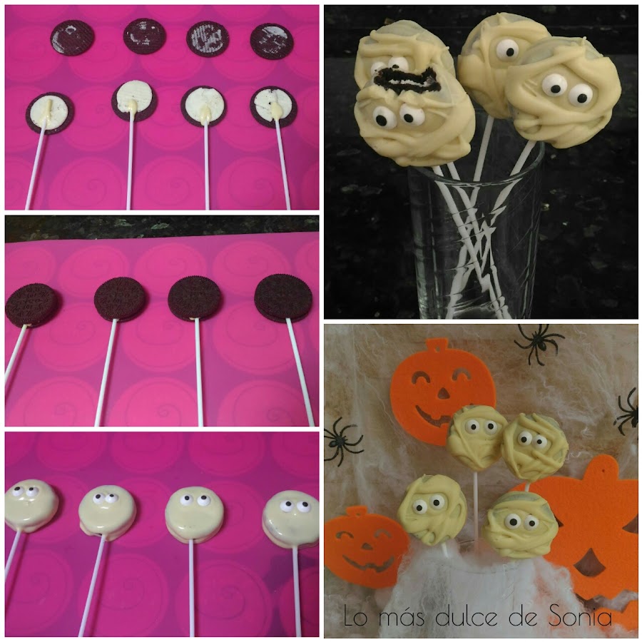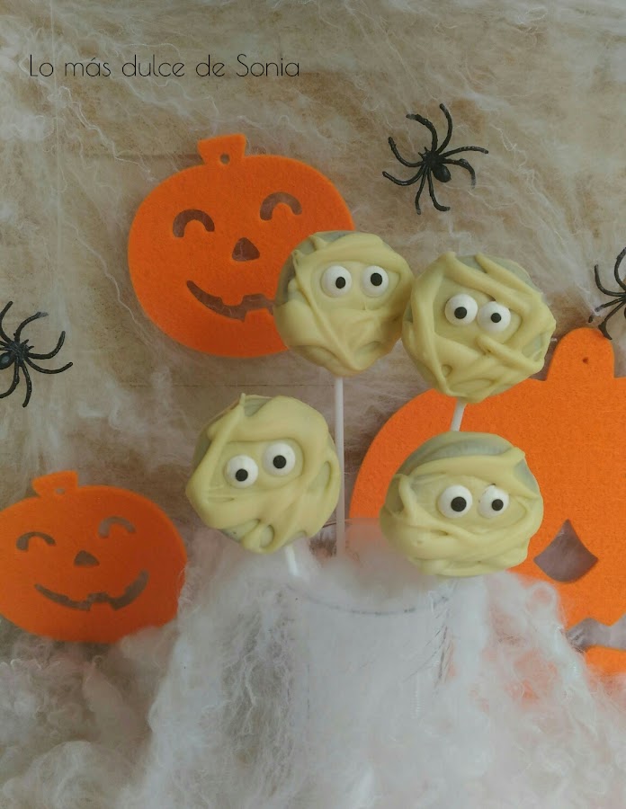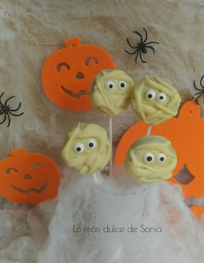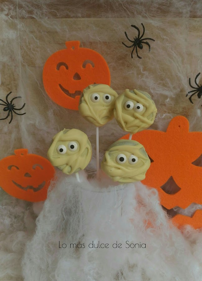 Colocamos los ojos y simulamos que hacemos las vendas con hilos de chocolate. Dejamos que endurezca el chocolate y a disfrutar.
