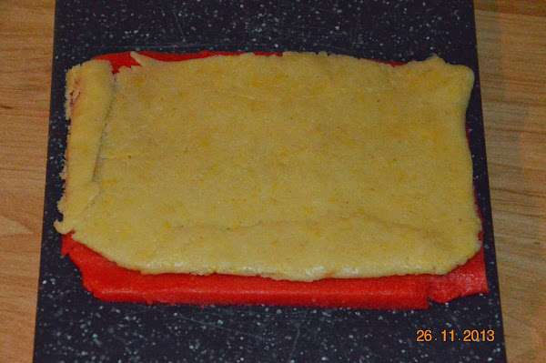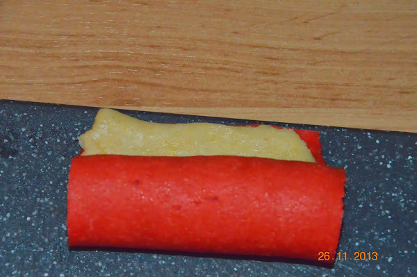 Colocamos los rectángulos uno sobre el otro y vamos enrollando con cuidado ambas masas, formando un rulo alargado.