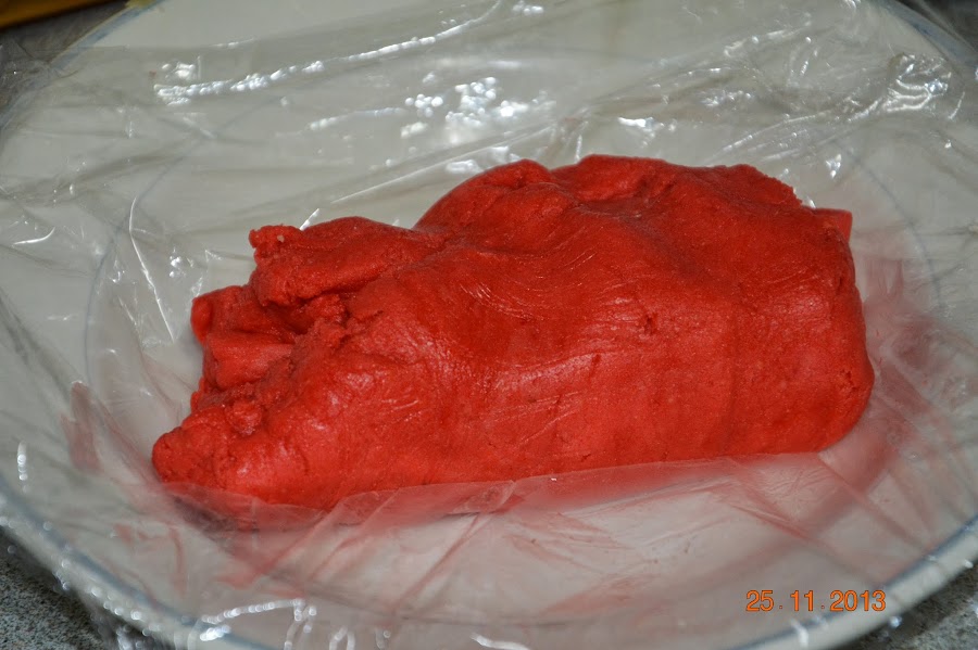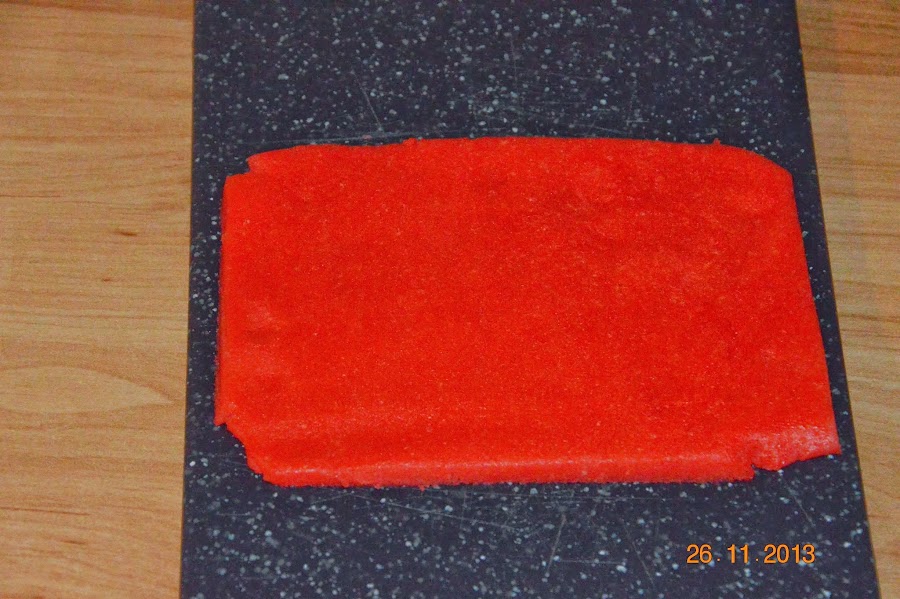 A la mitad restante le añadimos la esencia de almendras y la punta de un cuchillo de colorante rojo, accionamos el robot de nuevo hasta que el color sea homogéneo y procedemos del mismo modo que con la primer masa.