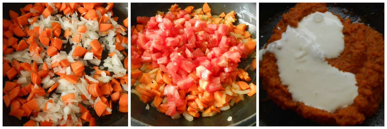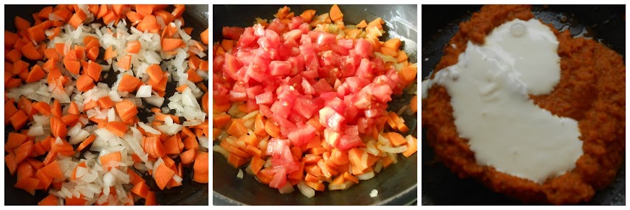 Colocar aceite en una sartén y cocinar a fuego bajo durante 30 minutos, cuidando que no se queme y si es necesario añadir agua. Condimentar a gusto. Una vez cocido triturar y añadir la nata (crema de leche).