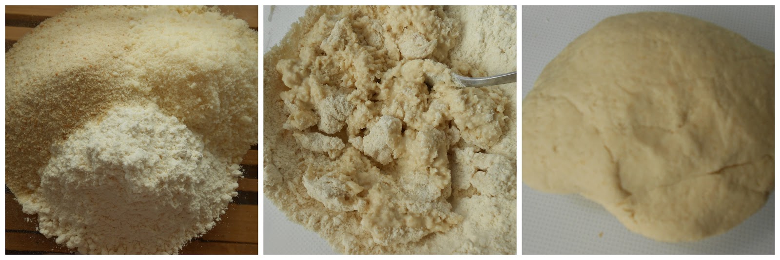 En un bol colocar la harina, el pan rallado, el queso rallado y la sal. Mezclar bien. Colocar en una taza la leche y el agua e incorporar poco a poco a la mezcla de ingredientes secos, uniendo con un tenedor y luego amasando hasta lograr una masa que no se pegue a los dedos. Cubrir la masa con un paño de cocina y dejar descansar 15 minutos.