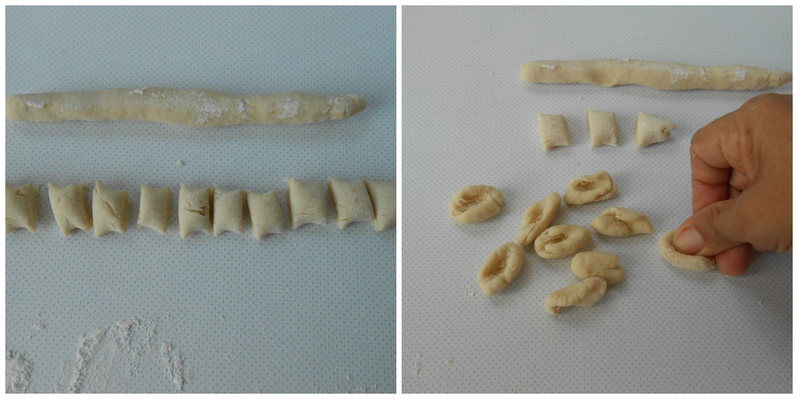 Luego espolvorear con harina la encimera (mesada) y dividir la masa en trozos y estirar formando cilindros finos. Cortar en porciones de 1 cm. Aproximadamente y presionar con el dedo pulgar para hacerle una hendidura en el centro, como se aprecia en la foto, dándole forma de ñoqui.
