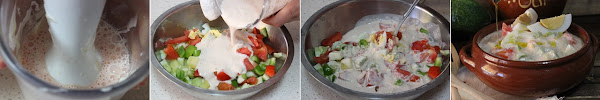 En el vaso de la batidora donde tenemos el tomate , pepino y pimiento echamos la mayonesa y lo trituramos todo bien.