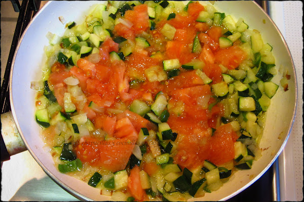 Una vez que el calabacin empieza a ablandar un poco, agregarle el tomate. Dejarlo cocinar a fuego lento unos 20 minutos aproximadamente.