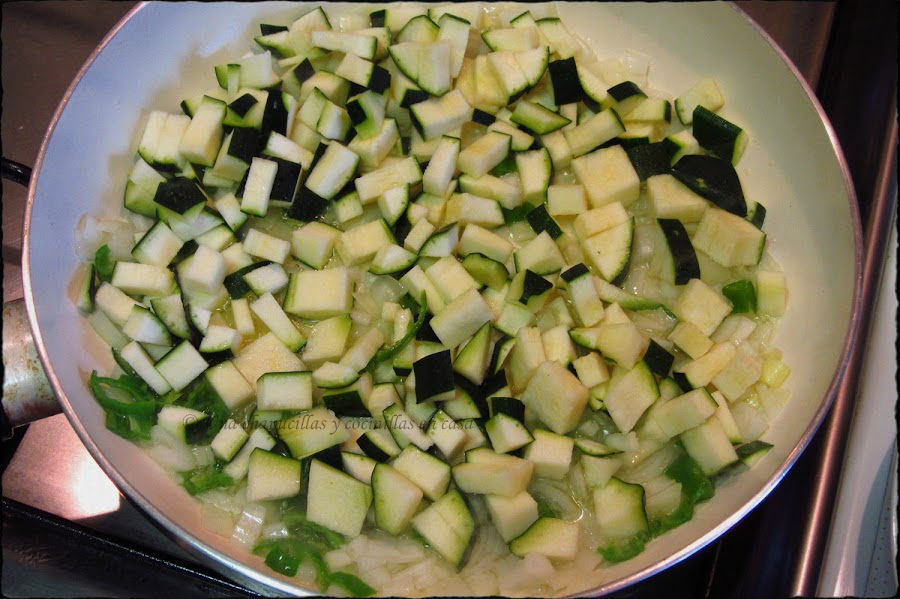 A continuación añadir el calabacin en dados al que también le hemos echado una pizca de sal y seguir cocinando a fuego medio.