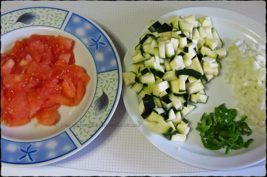 Lo primero lavar y trocear las verduras. A mi me gusta dejar los calabacines con piel. Los tomates me gusta pelarlos, para poder pelarlos mas facilmente, podéis escaldarlos unos segundos en agua hirviendo y rapidamente pasarlos a agua fría, su piel saldrá mejor.