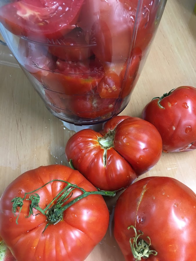 Se lavan y pelan los tomates, se quita el pedúnculo y se ponen en un vaso batidor cortados en trozos: