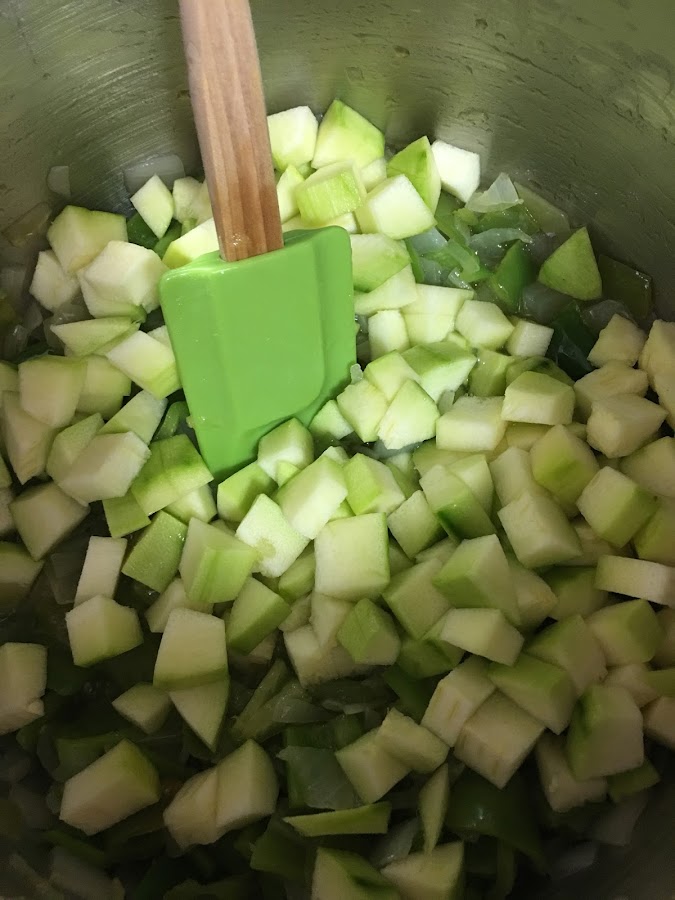 Se pela el calabacín, se corta en dados y se deja con un poco de sal (para que suelte el agua con la acidez) mientras se rehogan las otras verduras. Se agrega a la cazuela con la cebolla y el pimiento.