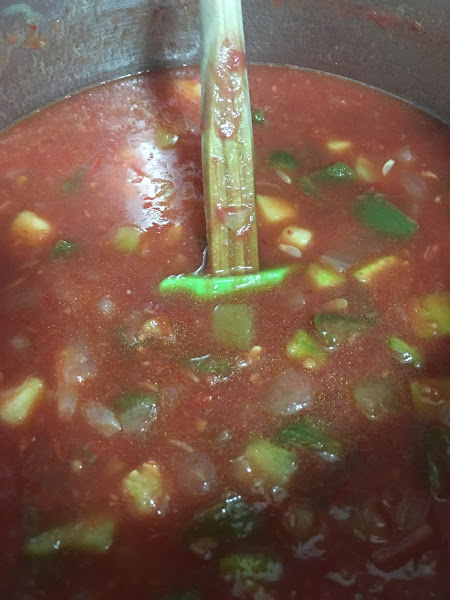 Se pone a fuego lento y se deja que se hagan las verduras, despacito, durante una hora, hasta que el calabacín se ablande bien.