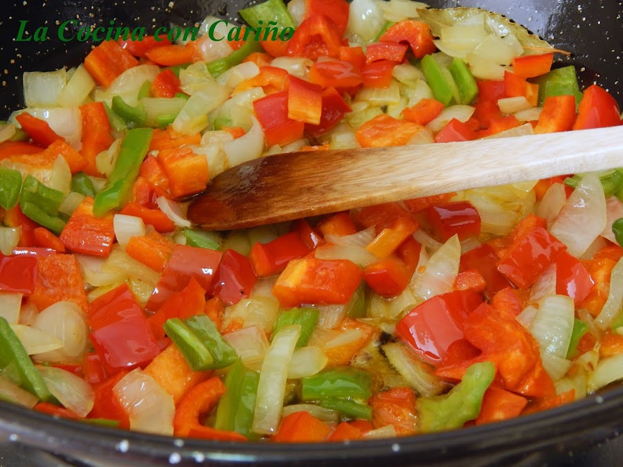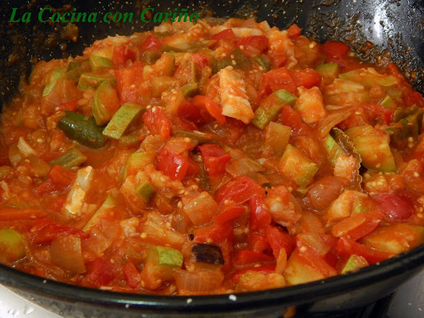 En el aceite caliente en un perol y a fuego medio/fuerte, empezamos pochando la cebolla, con un poco de sal para que sude. Un par de minutos después, el pimiento verde, con su sal. Un minuto después el pimiento rojo. Al poco el calabacín y 2 ó 3 minutos después la berenjena. Todo con su poquito de sal.