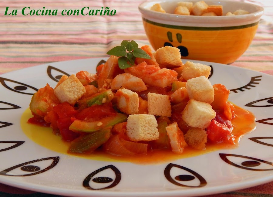 Para emplatar lo ponemos en el plato. Me gusta servirlo con espumadera, para evitar que pase algún exceso de jugo al plato si lo hubiera. Por encima lo regamos con unos daditos de pan tostados en el horno o fritos. Le da un contraste de textura estupendo. Así que Besos a todas, besos a todos, besos a……, en fin, besos, siempre muchos besos.
