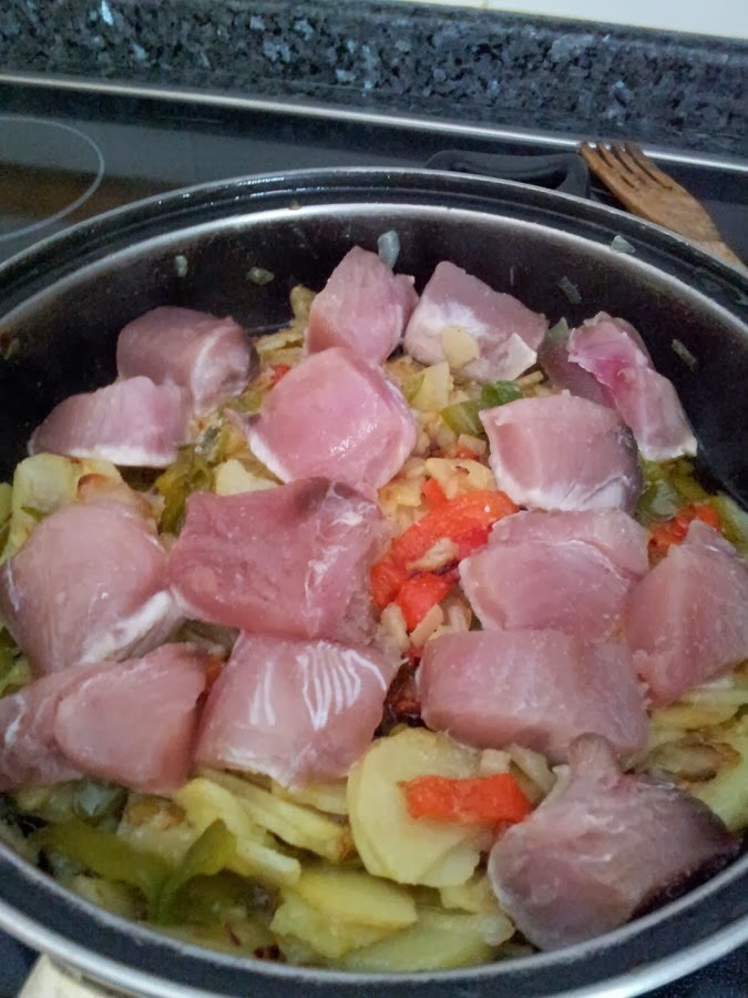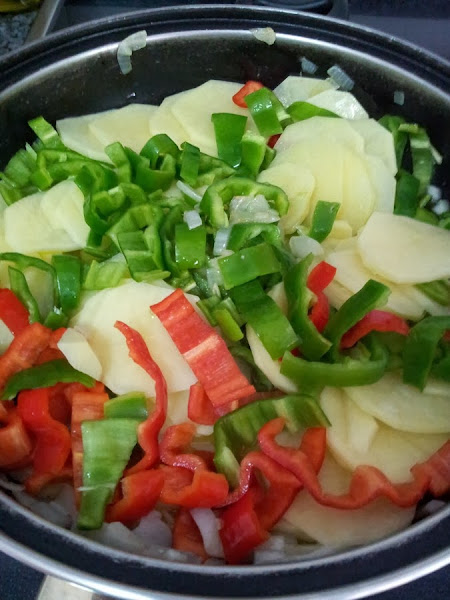 Añadimos bastante aceite en una sartén, para sofreír la cebolla junto con las patatas cortadas en rodajas los pimientos en tiras o en trozos no demasiado grandes, como más os guste y lo dejamos a fuego medio hasta que las patatas empiecen ablandarse, removiendo despacio para que no se ropan demasiado.