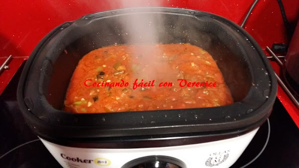 Para quien no conozca la olla "cooker 8 en 1" voy a darle unas indicaciones. Es una olla con 8 funciones, a cuál mejor, con gran capacidad y muy cómoda. Apenas ocupa espacio y muy versátil. Cuenta con la función "cocción lenta", aquí es donde hice el pisto. Puede que sea cocción lenta pero se hizo rapidísimo. Muy limpia y mantiene el calor mucho tiempo.